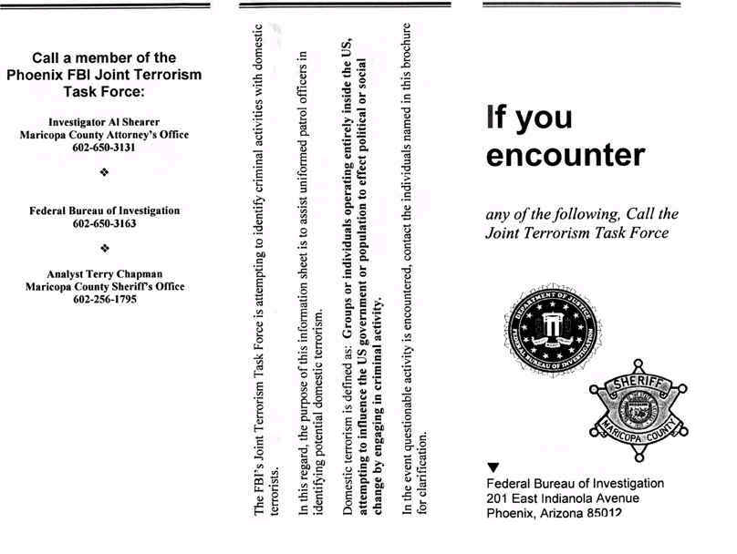 The Phoenix Federal Bureau of Investigation created this flyer during Clinton's Presidency, asking the recipients to help them fight domestic terrorism. It has been confirmed by many phone calls to the FBI and Phoenix local law enforcement that such publications were being given, by the FBI, to local law enforcement. It was not intended for the general public to know such FBI domestic terrorist definitions. "Defenders of the Constitution" are listed as potential terrorists. Do you fit the domestic terrorist profile?