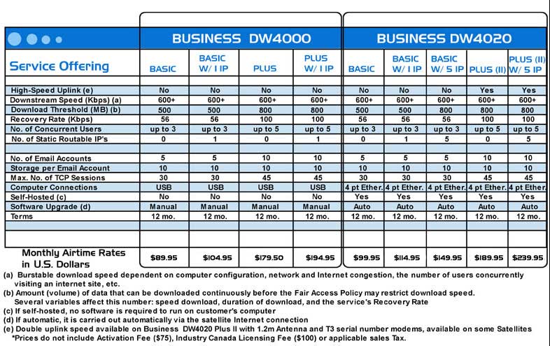 Plus - 1000 Tariff: This service will support maximum speeds of up to 128kbps upstream per site and up to 1024kbps downstream per site. There are 40 sites per inroute. The Plus - 1000 grade of service is designed for up to 5 PC's connected to the satellite terminal which operate within the assumed normal business working enviroment of a small medium enterp heavy downloading traffic patterns will only be reasonably supported with significantly less active PC's behind the satellite terminal Monthly Data Quota 4GB.