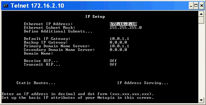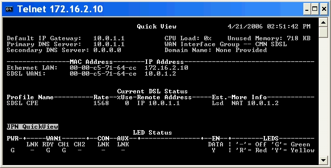 CPE Config: BASE CONFIG: Back to Back Netopia 7100 SDSL Networking SDSL BASE Config: Connection Profile Profile Name: SDSL Base Encapsulation Type... RFC1483 Interface group: Primary IP Profile Parameters Address Translation Enabled: No IP Addressing... Numbered Local WAN IP Address: 10.0.1.1 Local WAN IP Mask: 255.255.255.0 No Filter Sets, No RIP IP Setup Ethernet IP Address: 172.16.200.10 Ethernet Subnet Mask: 255.255.255.0 Define Additional Subnets... NO Default IP Gateway: 172.16.200.1 Backup IP Gateway: 0.0.0.0 Primary Domain Name Server: 172.16.200.1 Secondary Domain Name Server: 0.0.0.0 Domain Name: Receive RIP... Off Transmit RIP... Off Static Routes: Destination Subnet Next Gateway 0.0.0.0 0.0.0.0 172.16.200.1 10.0.1.0 255.255.255.0 10.0.1.2 <--- NOT NECESSARY IP Address Serving... Disabled =================================================== SDSL CPE Config: Connection Profile Profile Name: SDSL CPE Encapsulation Type... RFC1483 IP Profile Parameters Address Translation Enabled: Yes IP Addressing... Numbered NAT Map List... Easy-PAT List NAT Server List... Easy-Servers Local WAN IP Address: 10.0.1.2 Local WAN IP Mask: 255.255.255.0 No FIlter sets, No RIP IP Setup Ethernet IP Address: 172.16.2.10 Ethernet Subnet Mask: 255.255.255.0 Define Additional Subnets... NO Default IP Gateway: 10.0.1.1 Backup IP Gateway: 0.0.0.0 Primary Domain Name Server: 10.0.1.1 Secondary Domain Name Server: 0.0.0.0 Domain Name: Receive RIP... Off Transmit RIP... Off Static Routes: Destination Subnet Next Gateway 0.0.0.0 0.0.0.0 10.0.1.1 IP Address Serving Mode: DHCP Server 1st client address: 172.16.2.100 Client Default Gateway: 172.16.2.10 Linksys WRT54G Wireless Router Configuration Internet Setup (Enter ISP connection info here - usually Automatic Config) Network Setup Local IP Address: 172.16.200.1 Subnet Mask: 255.255.255.0 DHCP Server: Enabled Staring IP Address: 172.16.200.100 DNS: (Supplied by ISP) Advanced Routing Operating Mode: Gateway Static Routing: Set number 1 Route Name: DSL BASE Destination LAN IP: 10.0.1.0 Subnet Mask: 255.255.255.0 Default Gateway: 172.16.200.10 Interface: LAN & Wireless Set number 2 Route Name: DSL LAN Destination LAN IP: 172.16.200.10 Subnet Mask: 255.255.255.255 Default Gateway: 172.16.200.10 Interface: LAN & Wireless
