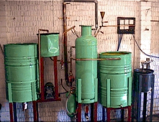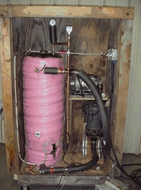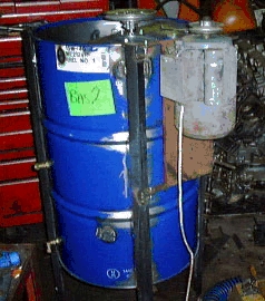 Dale Scroggins's processor is "a 100-liter processor made from mostly salvaged materials that almost fills itself, mixes everything, recovers the unused methanol, washes and dries the ester pretty much by flipping a few switches... I first evacuate the tank, then suck in the oil through a filter setup that I'm a little too proud of. I mix the methoxide separately, using a drill press with a paint mixer installed, then suck it into the tank. Then flip the pump switch. Watch through the clear hoses and marvel. Later, flip off the pump switch, check for separation, flip on the vacuum pump (which is connected to a liquid trap which is connected to the condenser which is connected to the tank) and watch the excess methanol collect in the trap. When no more collects, I open the tank to the atmosphere and drain off the glycerine. Then suck in water and begin the wash." (From a message to the Biofuel mailing list, 11 Jan 2001)
