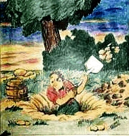 As for Olivier, he wasted not a moment. Fatigue was forgotten in the interests of his future as a banker. By dawn's first light he dug a pit into which he rolled the barrel. He then filled it in, transplanting a small shrub to the spot about which he carefully arranged sod. It was well hidden.