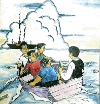 An explosion had blown their ship apart. Each one grasped the first bit of wreckage that came to hand, And when it was over there were five left, five huddled on a raft which the waves carried along at their will, As for the other victims of the disaster, there was no sign of them.